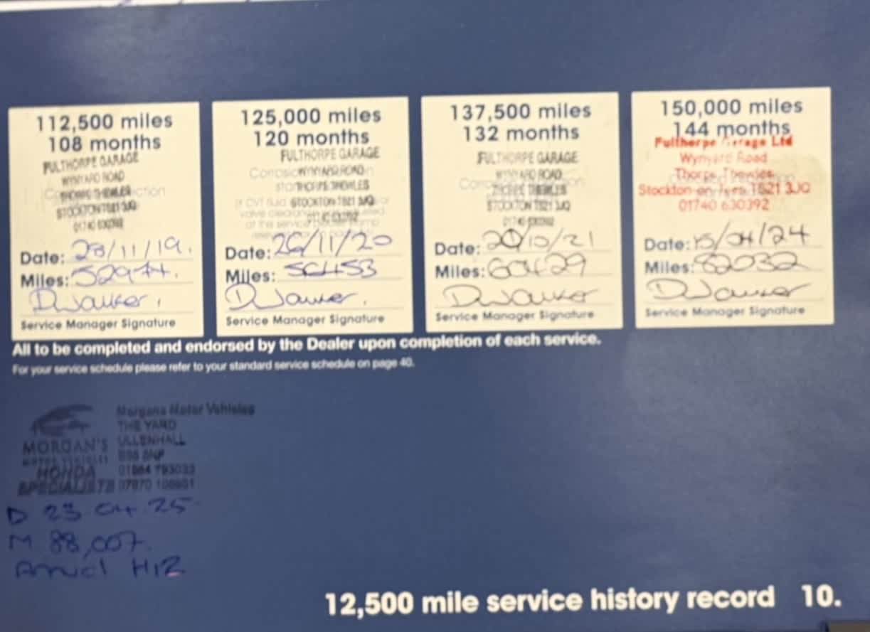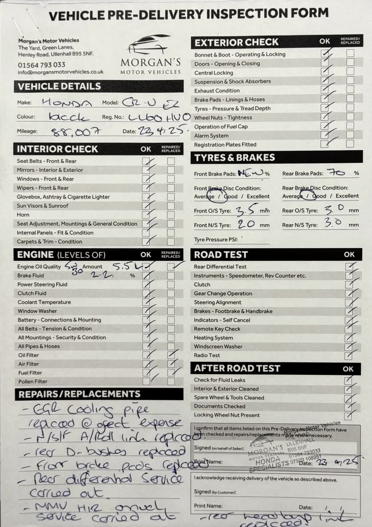 Our MMV service consists of checking all lights and levels, as well as adding fully synthetic low ash Valvoline 5W30 Motor oil, a new oil filter air filter and pollen filter (pollen if applicable) to this lovely vehicle. This package is something that very few independents offer, and we believe adds exceptional value and most importantly peace of mind for you our customers . We can confirm that tyres are of good quality across both axles with the brake pads and brake discs in healthy condition. To complete our handover we will help the new owner by going through all relevant documents such as the V5 Registration certificate transfer and taxation, and in addition set up 6 months warranty for your convenience. To summarise a fantastic family vehicle with low running costs and insurance, makes the Automatic CR-V an excellent purchase.